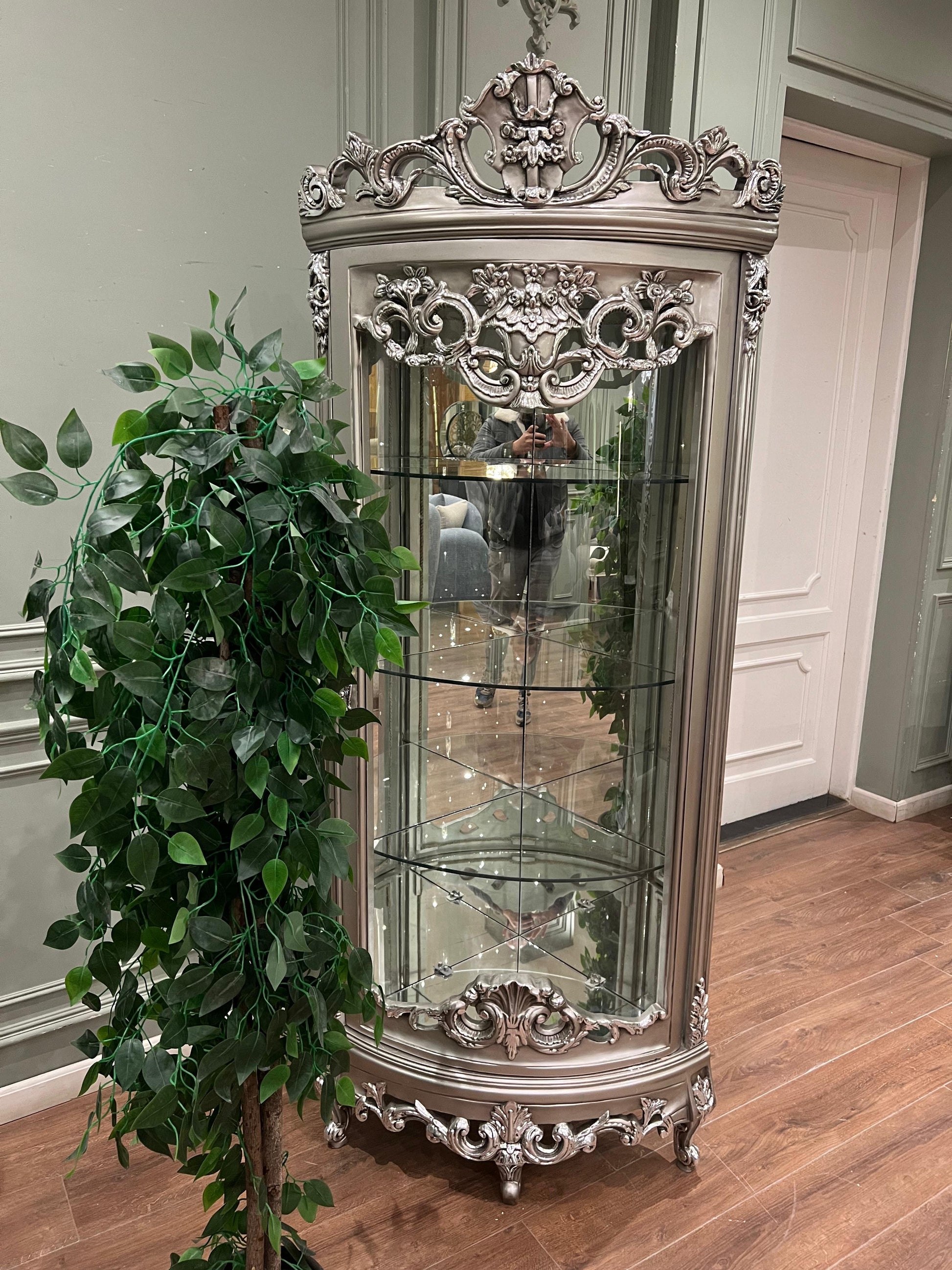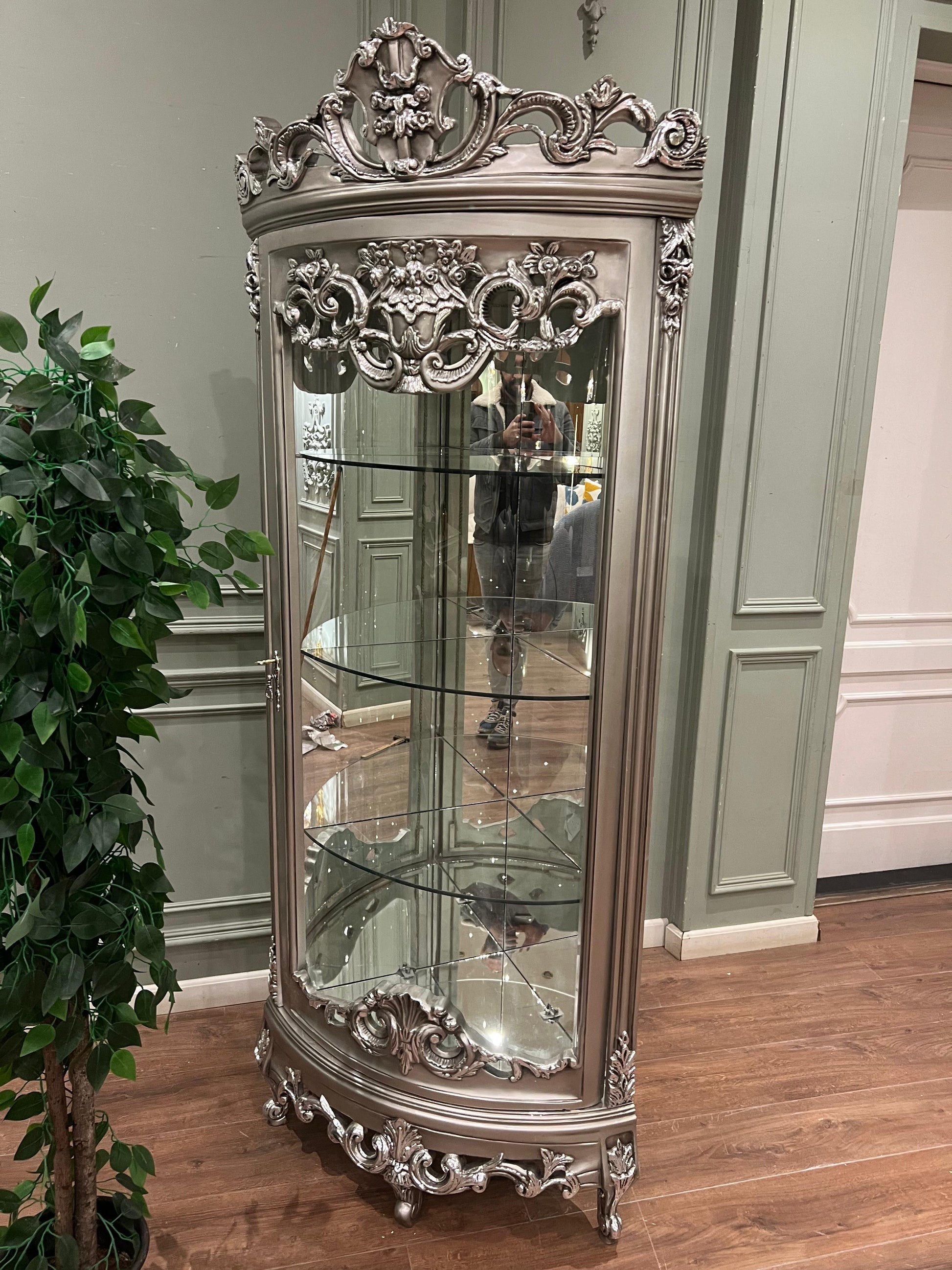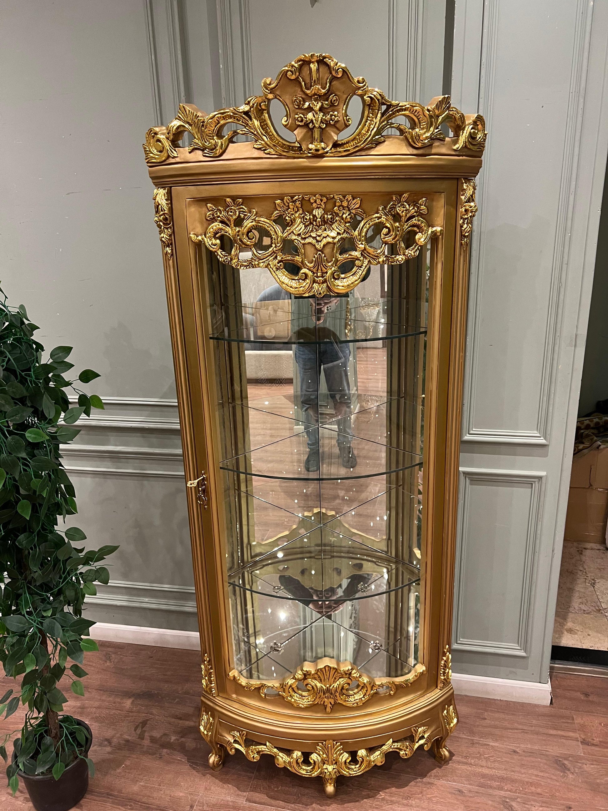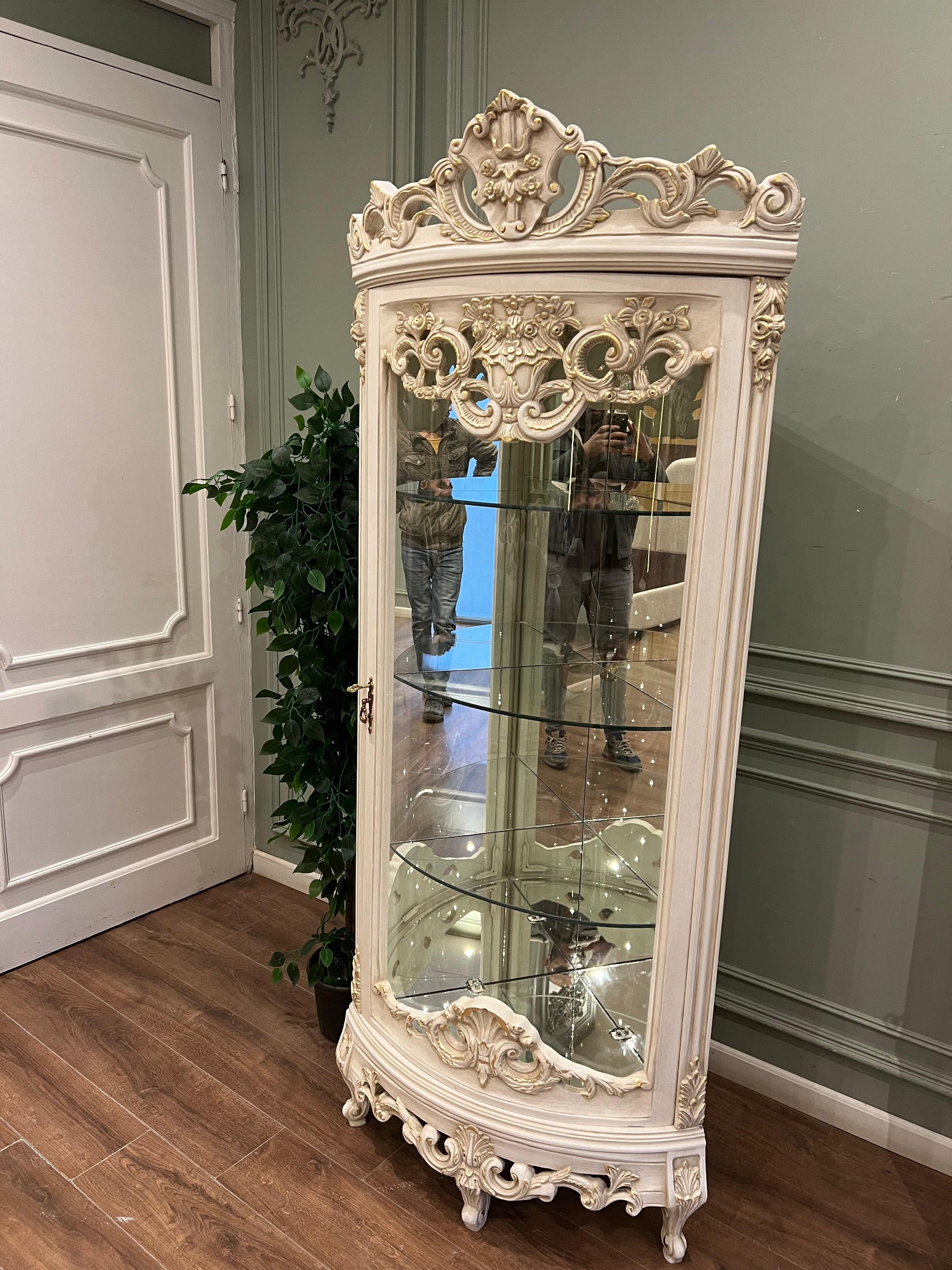 This exquisite hand-carved wooden corner glass display cabinet showcases meticulous craftsmanship, with intricate detailing adorning its frame. The cabinet is designed to fit seamlessly into a corner, maximising space while offering a stunning focal point.